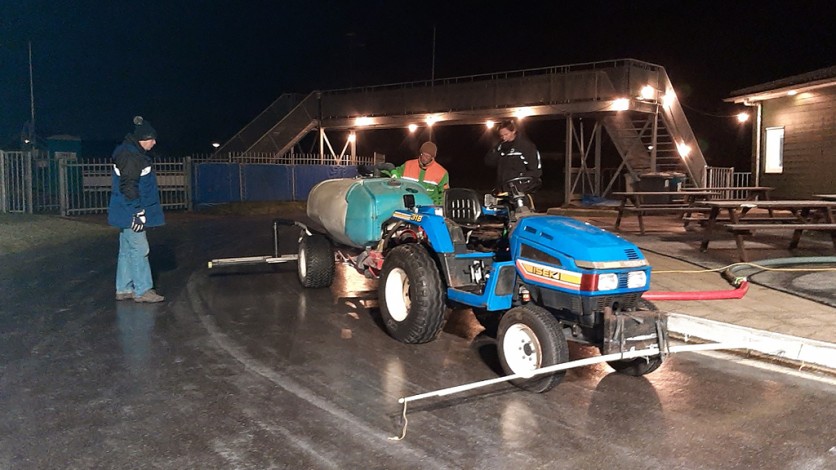 Het aanleggen van de natuurijsbaan is een precies proces. IJsclub Otweg gebruikt hiervoor een trekker met een aangepaste watertank. Via een speciaal sproeisysteem wordt het water ronde na ronde gelijkmatig over de baan verdeeld.