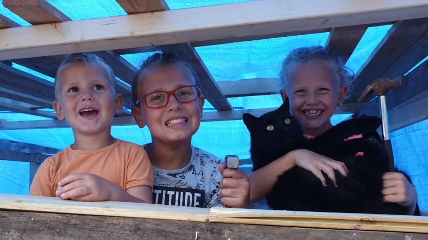 Dean toont ondertussen zijn timmermanskunsten en laat zien hoe je hout moet zagen. 'Ik mis mijn vrienden wel een beetje, maar dit is ook leuk. Een keer alleen met mijn broertje en zusje.' Daarmee doelt hij op de 3-jarige Jaylen en de 6-jarige Elena. Wie denkt dat hutten bouwen vooral voor jongens is, heeft het volgens Elena helemaal mis. 'Vrouwen kunnen ook gewoon bouwen. En sterk zijn', countert ze. En wat ze van haar grote broer leert? 'Niet huilen.'