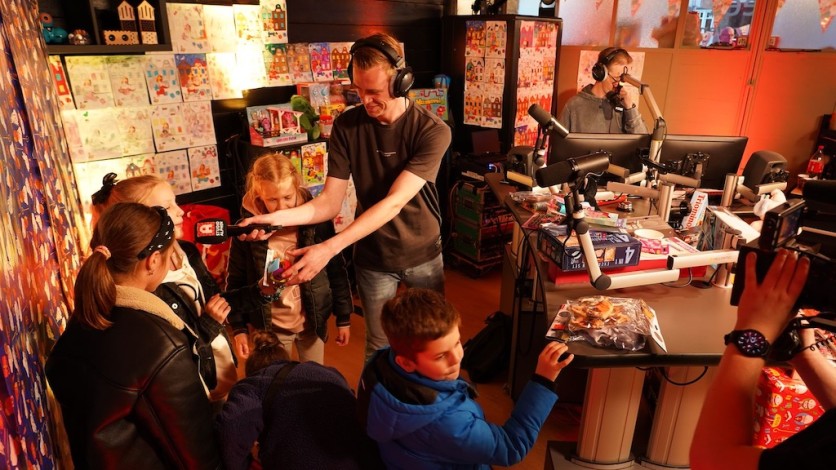Studio Alphen voert actie door middel van een radio-uitzending vanuit onze tijdelijke studio in de bibliotheek aan de Aarkade. De presentatoren houden daar live-interviews met mensen en organisaties die cadeaus in komen leveren.